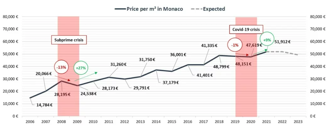 2023 год выглядит более неоднозначно: процентные ставки находятся на высоком уровне, а глобальная экономическая рецессия надвигается. Вполне вероятно, что, как и рынок недвижимости США, который уже переживает спад, рынок недвижимости Монако начнет замедляться. Однако этот прогноз следует рассматривать в контексте исторических показателей монегасского рынка недвижимости, который продемонстрировал большую устойчивость во время недавних экономических спадов.